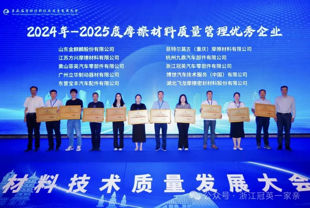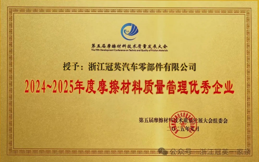 经过主办方权威专家委员会的严格评审,浙江冠英凭借在品质管理与质量控制方面的扎实工作和突出表现,获评“2025年度摩擦材料质量管理优秀企业”。 这一荣誉是对公司将“苦练内功”理念切实融入日常运营管理的直接印证与权威认可。