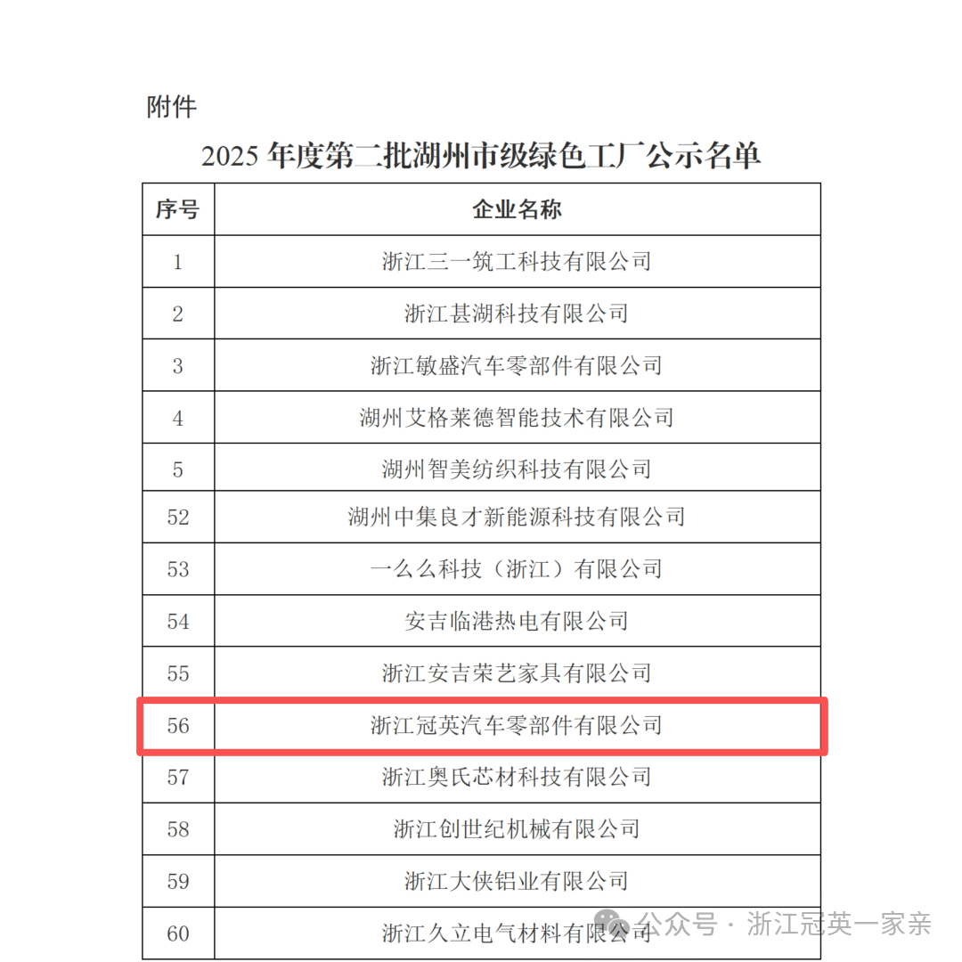 根据湖州市经济和信息化局《关于公布2025年度湖州市第二批绿色工厂名单的通知》,冠英公司凭借在绿色制造领域的系统性实践与突出成效,成功获评“湖州市级绿色工厂”称号。这一荣誉是对公司20年深耕汽车零部件行业、坚守绿色低碳发展战略的权威认证,标志着企业在可持续发展道路上实现重要里程碑。
