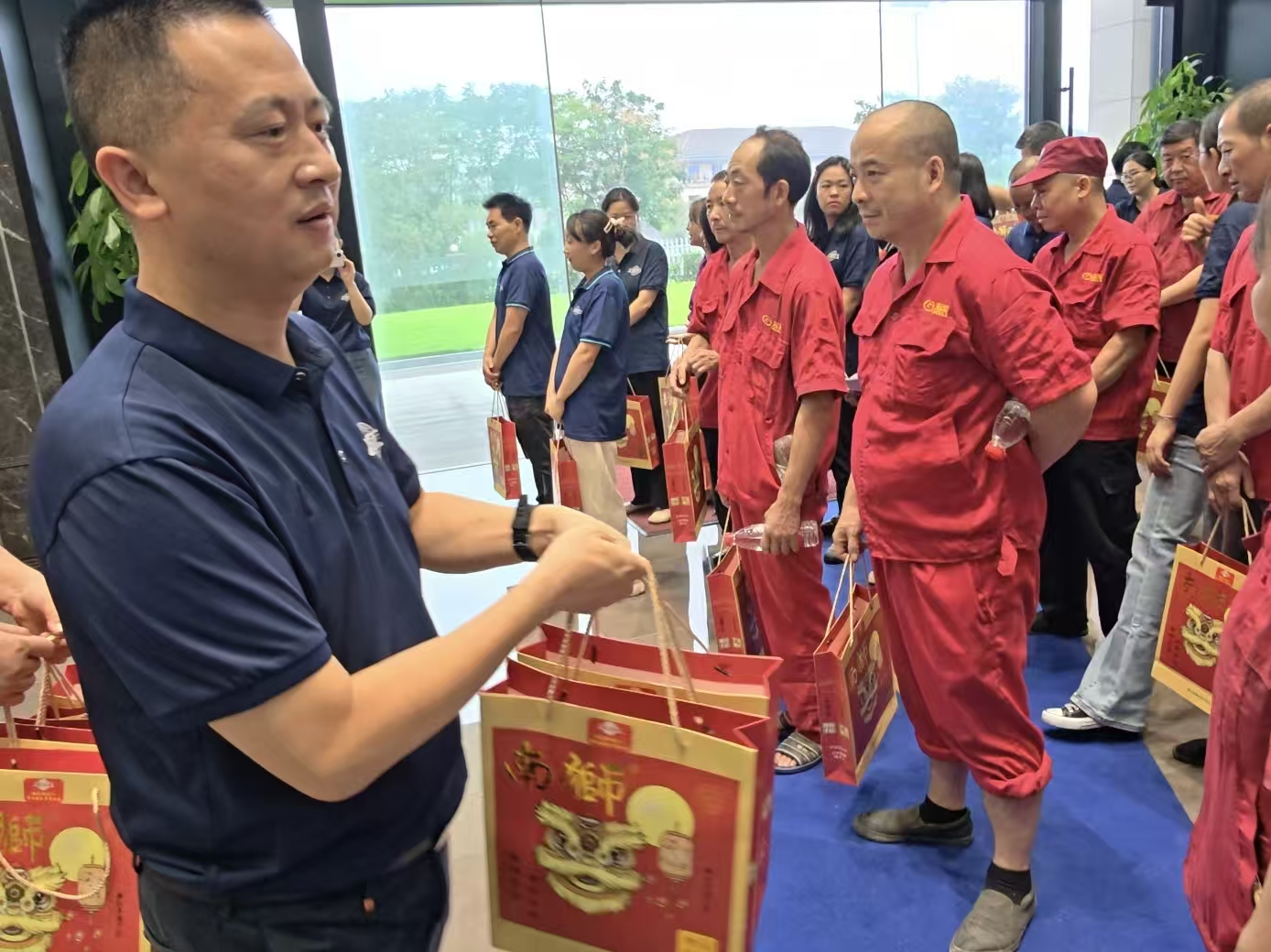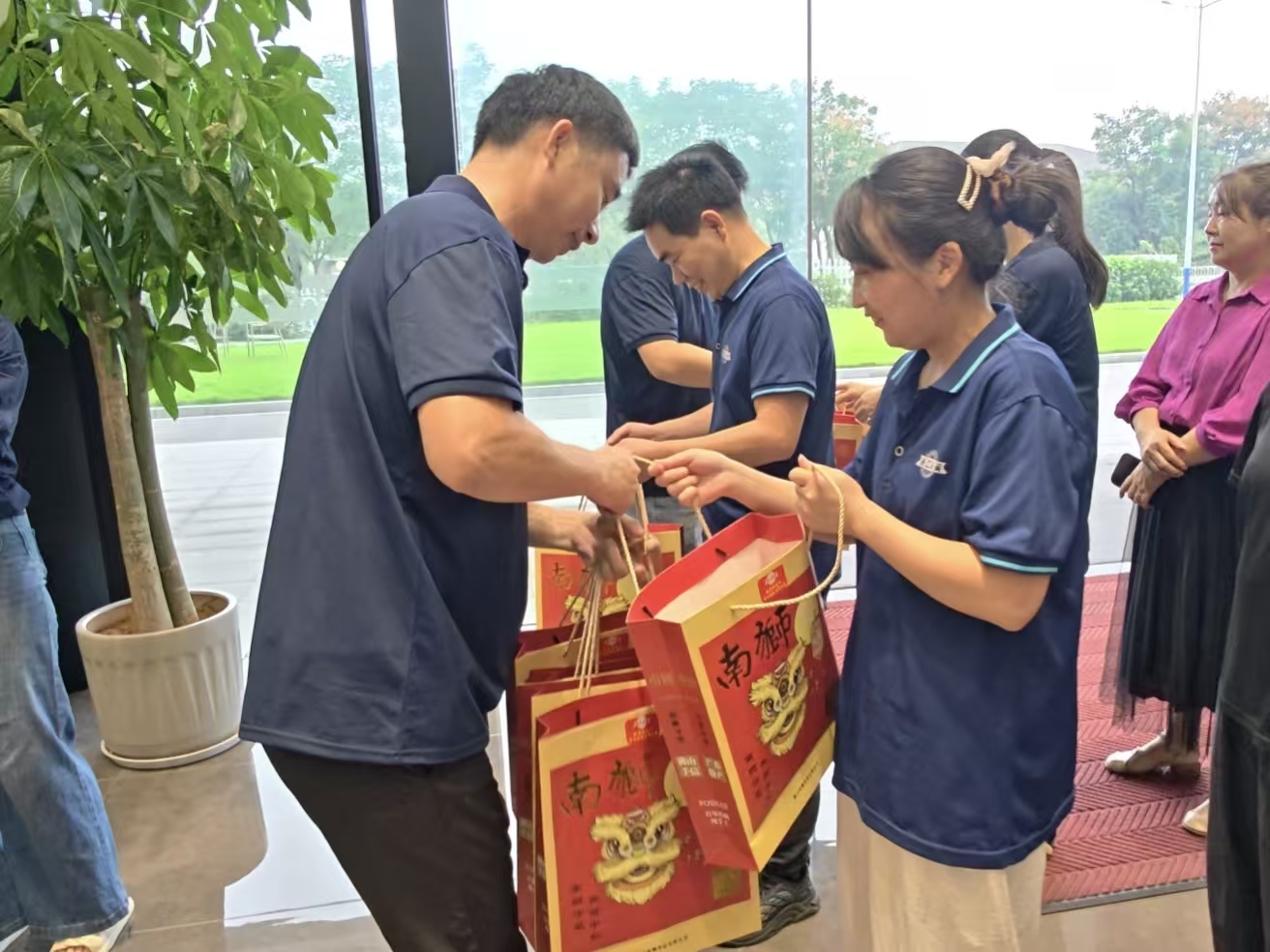 随后,进入了月饼发放环节。一盒盒精心准备的月饼礼盒被传递到各部门代表及每一位员工手中。现场秩序井然,欢声笑语不断,每个人的脸上都洋溢着喜悦与幸福的笑容。手中沉甸甸的月饼,是公司满满的关怀,更是“家”的温暖味道。