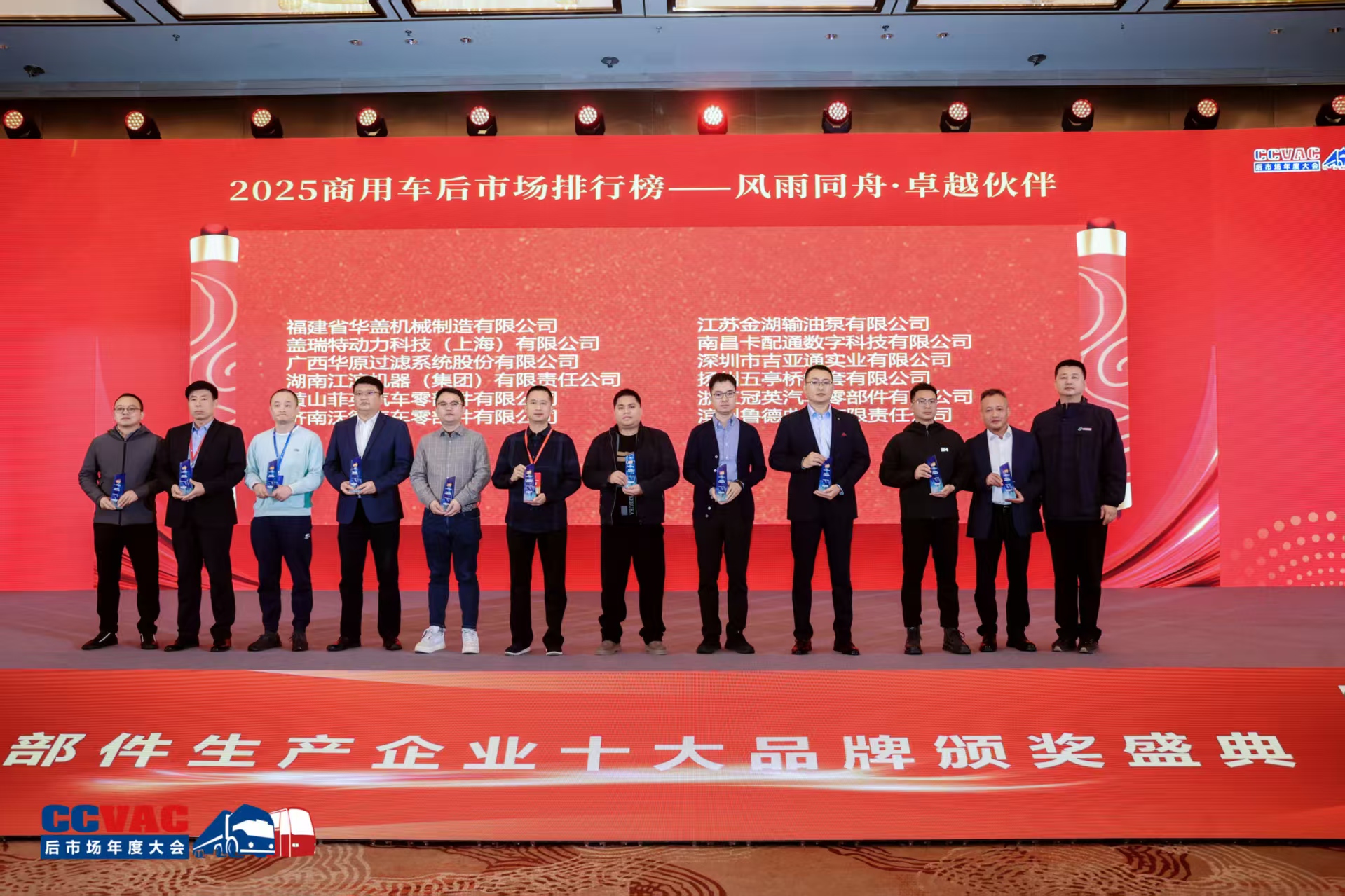 大会同期还举办了2025商用车后市场排行榜颁奖典礼。该评选由全国商用车零部件品牌传播委员会、中国汽车工业配件销售有限公司及大会组委会联合主办,以“客观、公平、权威”为原则,历经严苛筛选。凭借在产品品质、技术创新与市场口碑上的突出表现,浙江冠英脱颖而出,斩获“2025年度风雨同舟卓越伙伴奖”;总经理赵云凤也因其卓越的领导力与行业贡献,荣膺“2025年度闪耀人物”称号。